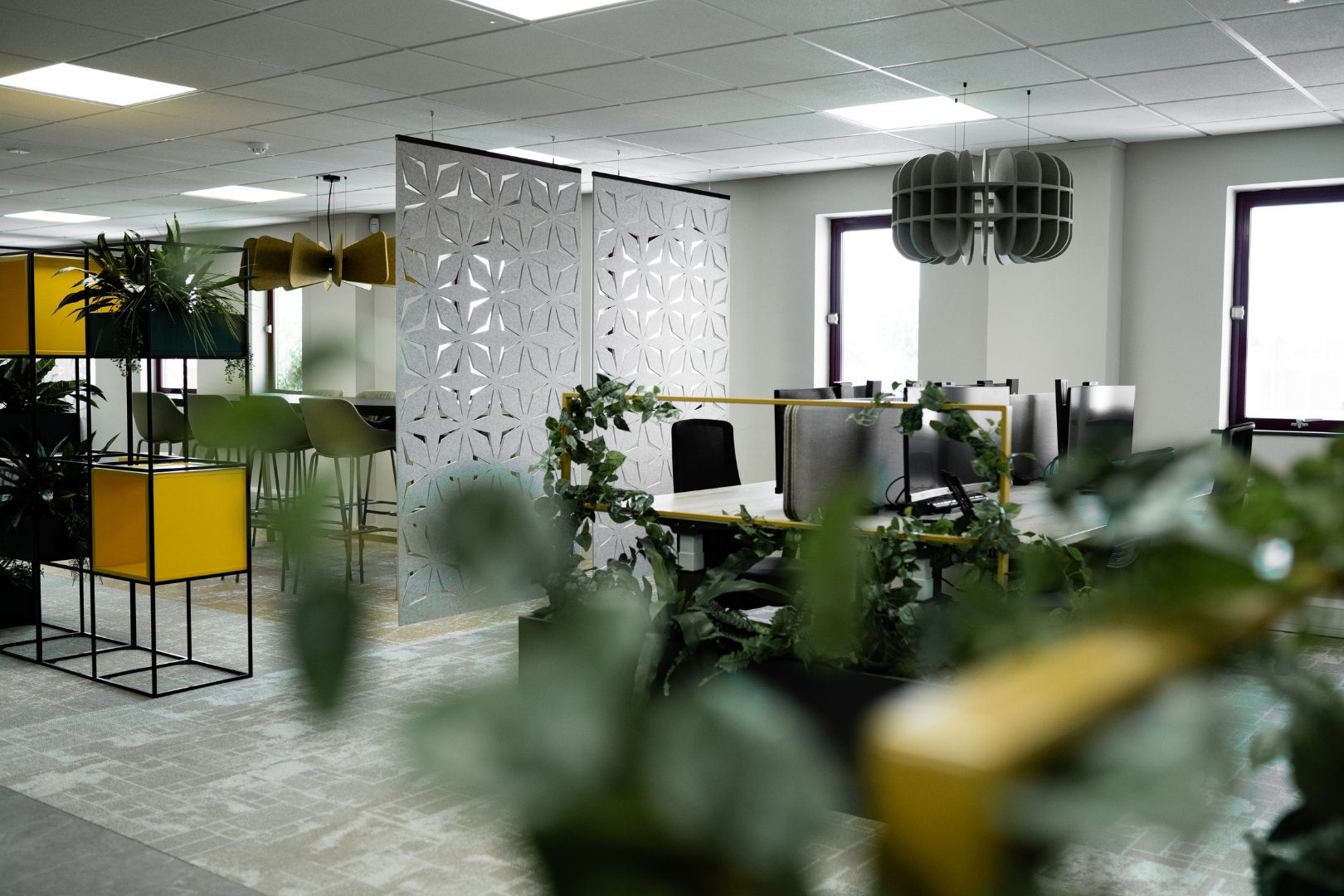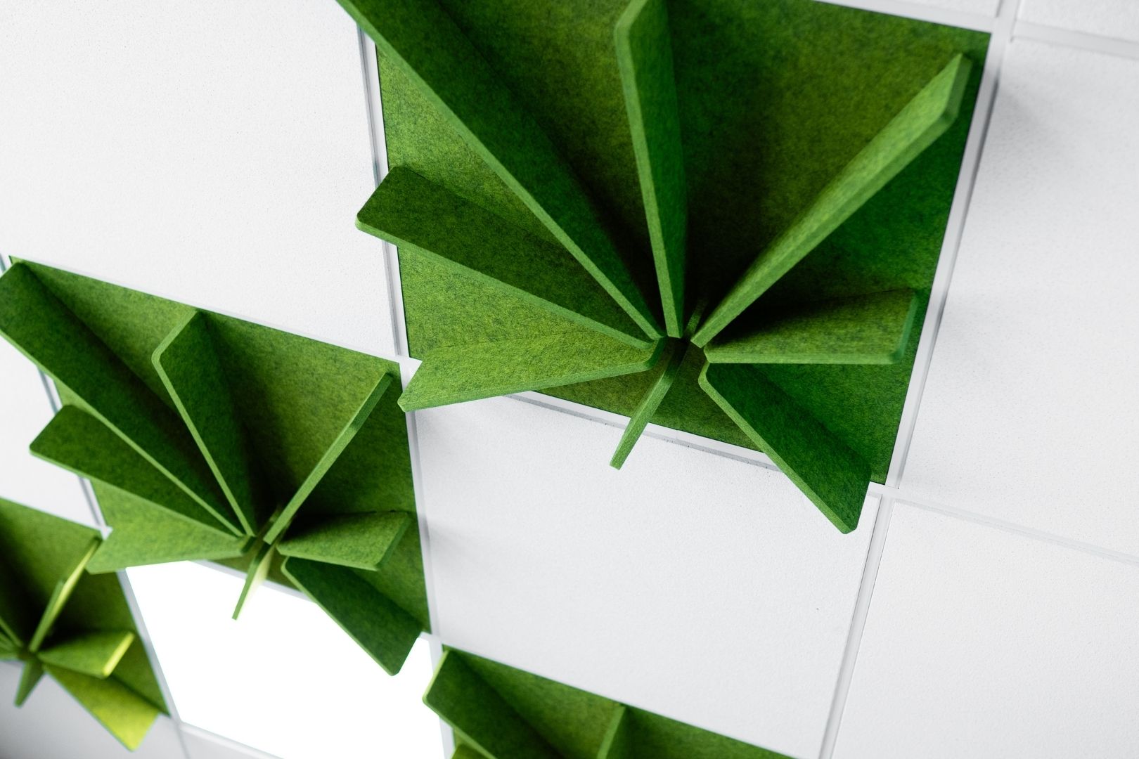 Across the offices, Lull suspended acoustic screens and Flott ceiling tiles provide flexible space division — visually light yet highly functional. The Lull screens enable transitions between quiet focus zones and collaborative hubs, supporting a variety of workstyles while maintaining a cohesive design language.