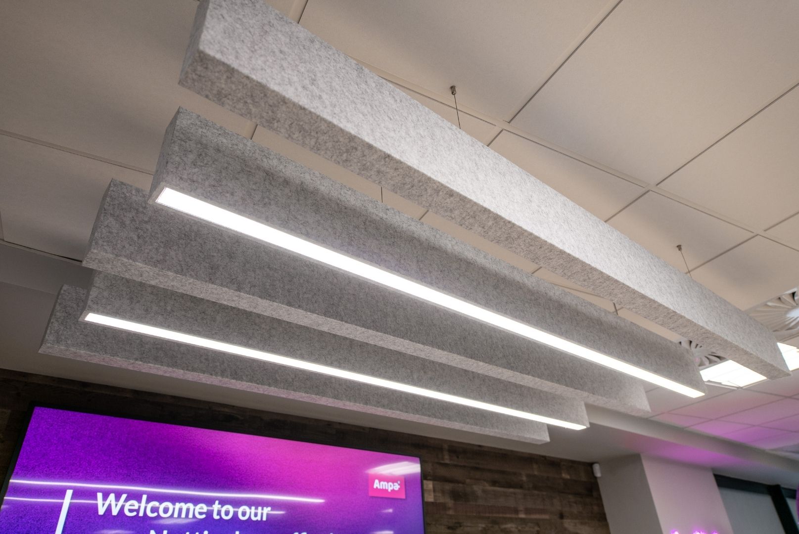 To complement this, Diffuse acoustic rafts were installed overhead, adding both performance and presence. Lighting was incorporated directly into the rafts, creating soft ambient illumination while helping to diffuse sound in larger, open areas. This dual-purpose approach added character and practicality without interrupting the flow of the space.